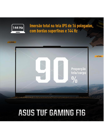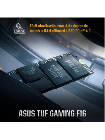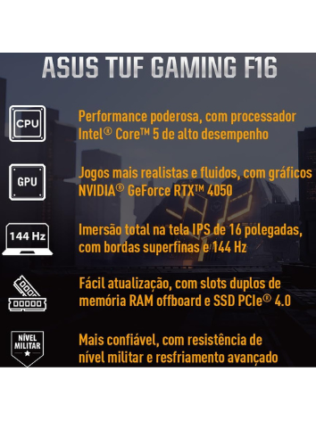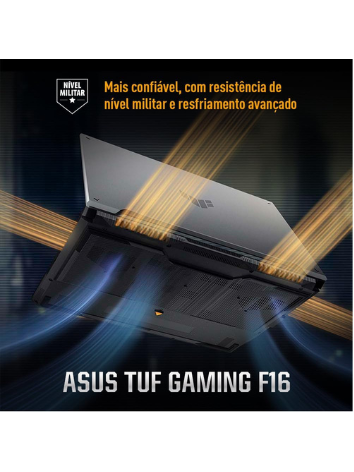 O poderoso notebook gamer ASUS TUF Gaming F16 une performance de alto nível com design robusto e estiloso. Feito para gamers exigentes e profissionais que buscam tecnologia de ponta, este computador transforma a experiência de jogo e trabalho, com processador Intel® Core™ 5 210H de alto desempenho e gráficos dedicados NVIDIA® GeForce RTX™ 4050. Há ainda tela imersiva com bordas finas, fácil atualização de memória RAM e SSD, e resistência de nível militar para aguentar qualquer tranco. DESEMPENHO E REALISMO SEM LIMITES No coração do ASUS TUF Gaming F16 está o poderoso processador Intel® Core™ 5 210H (Série 2) de alto desempenho. Desde os mais pesados softwares profissionais até os jogos mais exigentes rodam com agilidade e sem interrupções. Com suporte da placa de vídeo dedicada NVIDIA® GeForce RTX™ 4050, os jogos ganham mais realismo e fluidez. As tecnologias MUX Switch e NVIDIA® Advanced Optimus aprimoram não só os efeitos visuais, como também o gerenciamento de energia para gerar gráficos impressionantes e altas taxas de quadros por segundo. TELA IMERSIVA E RÁPIDA O ASUS TUF Gaming F16 conta com tela nível IPS de 16 polegadas, resolução Full HD+ (1.920 x 1.200 pixels) e proporção 16:10, que entrega imagens vibrantes e realistas com tempo de resposta de somente 3 milissegundos. As bordas superfinas maximizam a área de visualização, resultando em 90% de proporção entre a tela e o corpo do notebook, para cada detalhe ser apreciado com clareza e profundidade. Além disso, a alta taxa de atualização de 144 Hz garante maior fluidez às imagens que aparecem na tela, eliminando qualquer borrão e mantendo a vantagem competitiva mesmo nos momentos mais intensos da jogatina. ATUALIZAÇÃO FÁCIL E CONECTIVIDADE COMPLETA Pensando na personalização e no futuro, o ASUS TUF Gaming F16 foi desenvolvido para facilitar upgrades. Com slots duplos de memória RAM offboard e dois espaços para SSD PCIe® 4.0 disponíveis, você tem total flexibilidade para expandir as configurações conforme suas necessidades. Para manter você sempre conectado, o notebook gamer ainda oferece vasta gama de portas para dispositivos, incluindo USB Tipo-A e Tipo-C, HDMI 2.1, porta de rede RJ-45, conector combo de áudio de 3,5 mm e entrada de energia dedicada (DC-in). Enquanto isso, o Wi-Fi 6 e Bluetooth 5.3 garantem transferências de arquivos, assim como conexões sem fio rápidas e estáveis para jogos online, streaming e trabalho remoto. CONFIABILIDADE E REFRIGERAÇÃO AVANÇADA O ASUS TUF Gaming F16 é robusto, com construção certificada pelo exigente padrão MIL-STD-810H de resistência de nível militar. Essa validação garante que o notebook foi submetido a testes rigorosos de durabilidade que simulam desafios do uso diário, como vibrações e impactos, sem perdas de desempenho ou danos ao chassi. Para ainda mais confiabilidade, o sistema de resfriamento avançado utiliza ventoinhas Arc Flow™ duplas, com até 4 saídas de ar e 5 tubos de calor. Esse sofisticado mecanismo de dissipação de calor mantém a temperatura ideal, mesmo durante sessões intensas de jogos, evitando superaquecimento e garantindo que o hardware opere sempre no potencial máximo. ÁUDIO POTENTE E TECLADO RETROILUMINADO Com sistema de som imersivo, o ASUS TUF Gaming F16 ostenta certificados de áudio Dolby Atmos e Hi-Res de alta qualidade, além de cancelamento de ruído bidirecional por Inteligência Artificial. Esses recursos proporcionam experiência sonora envolvente, em que cada explosão, diálogo e efeito sonoro é ouvido com clareza e profundidade. Por fim, o teclado incorpora retroiluminação RGB de uma zona, assim como a tecla Copilot dedicada para fácil acesso ao assistente de IA do Windows. Aproveite o desempenho monstro e a imersão total do ASUS TUF Gaming F16!