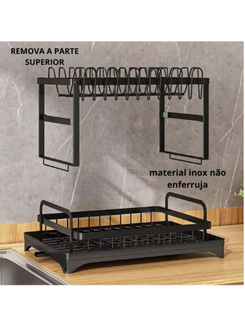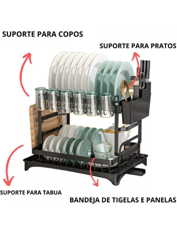 Com a capacidade para até 11 pratos, possui dois andares que otimizam o espaço, permitindo a secagem eficiente de talheres, copos e pratos. O escorredor conta com porta talheres e compartimento para copos, mantendo tudo em seu devido lugar e ao alcance das mãos. Suas dimensões de 42 cm de comprimento, 30 cm de largura e 29 cm de altura fazem com que se adapte facilmente a qualquer pia de cozinha ou mesa.