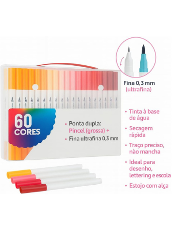 Kit 60 Canetinhas Ponta Dupla (Pincel + Fina) + Livro de Colorir Sttich Capa Dura 50 Folhas – Estojo com Alça para Desenho
