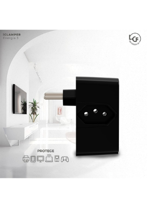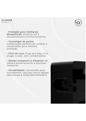 Protetor Contra Surtos Elétricos (DPS) CLAMPER 127/220V, 10 Amperes, 3 Pinos, para PC, PS5, Xbox, Smartphone, Monitor, Impressora, etc – iCLAMPER Energia 3 PretoLCF, 3 tomadas